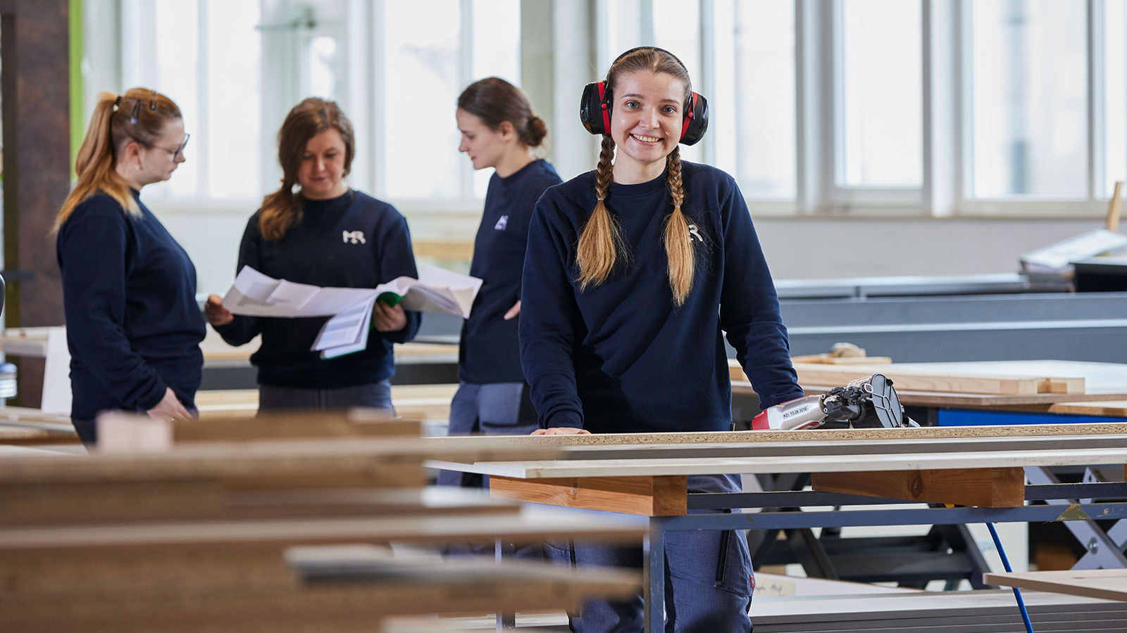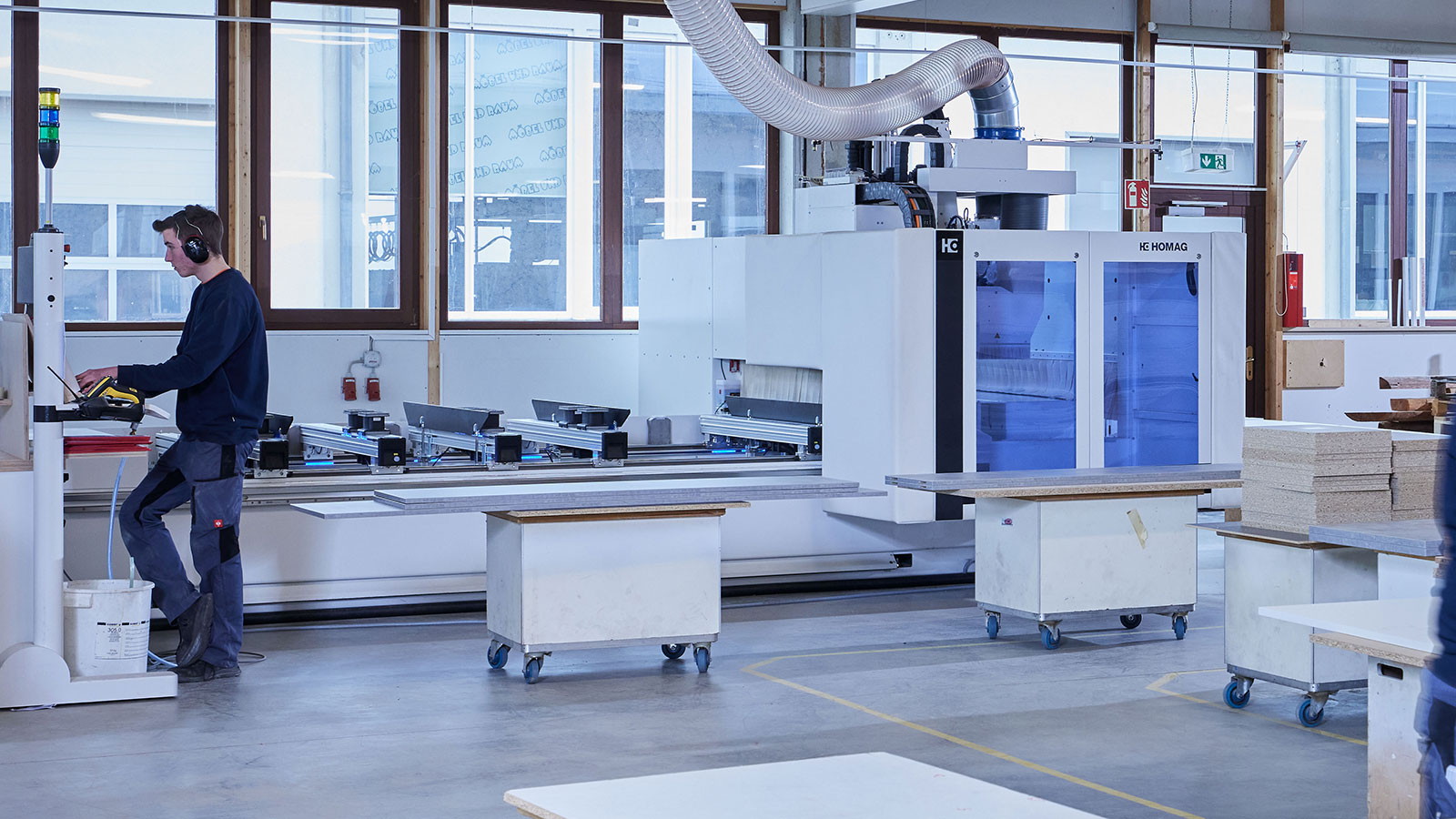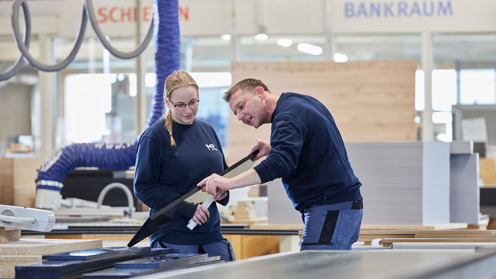 Der Betrieb läuft nahtlos weiter, weil alle Verantwortung übernehmen. Das macht auch Nina Weber-Romeis. Sie kommt ursprünglich aus der Gastronomie. Vor wenigen Monaten fängt sie halbtags im Lager an. Mittlerweile übernimmt sie immer mehr Schreinertätigkeiten, denkt sich in Prozesse ein und bedient erste Maschinen selbstständig. Flexible Arbeitszeiten und fachfremde Kollegen: Thomas Schuhmann ist begeistert, wie reibungslos beides funktioniert – auch dank der durchgehend intuitiven Bedienung des Maschinenparks.