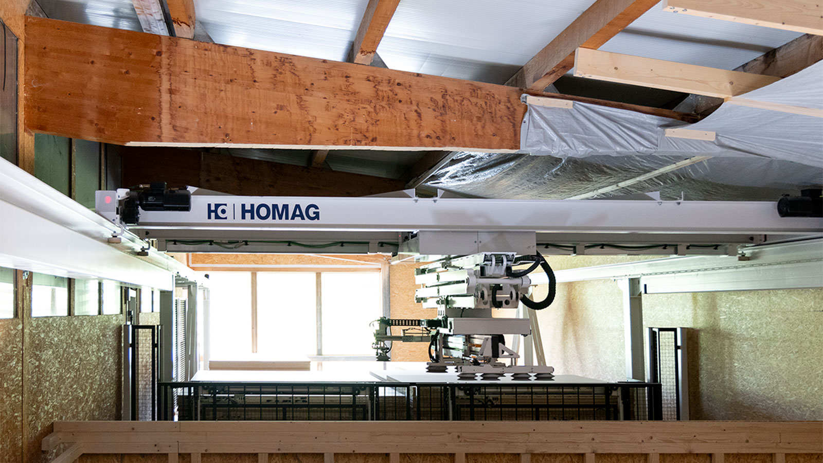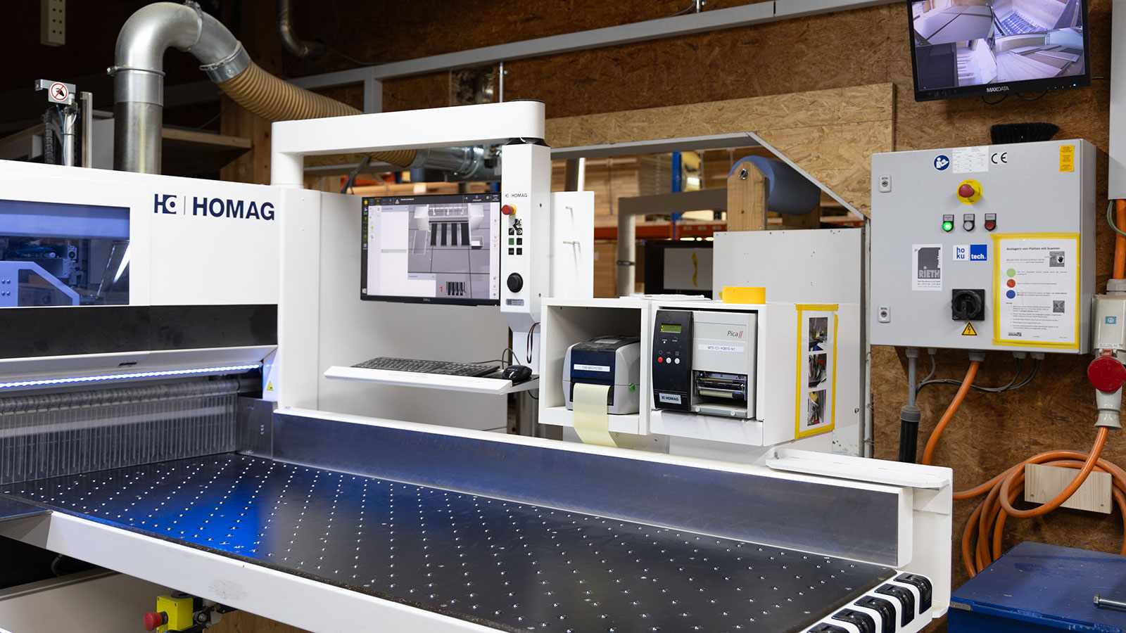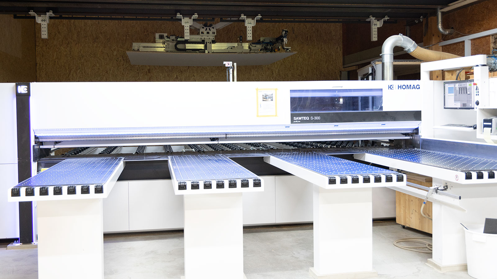Die Wahl fiel auf die Plattensäge SAWTEQ S-300 und das Flächenlager STORETEQ P-310. Weil der Platz jedoch belegt war, rückte das Herz der Produktion von der Mitte an den Rand – und das Lager ging in die Luft. Die Säge kam an den früheren Lagerplatz, das Lager wanderte unter das Dach mit schrägen Decken. Zum Schutz der Mitarbeiter wurde ein hochfahrbarer Zaun eingebaut. HOMAG setzte all das um – und damit wohl das erste Flächenlager in der Schweiz, das nicht auf derselben Ebene wie die Werkstatt steht. „Nach kurzer Eingewöhnung läuft die Traverse schnell, sicher und zuverlässig“, sagt Vogel.