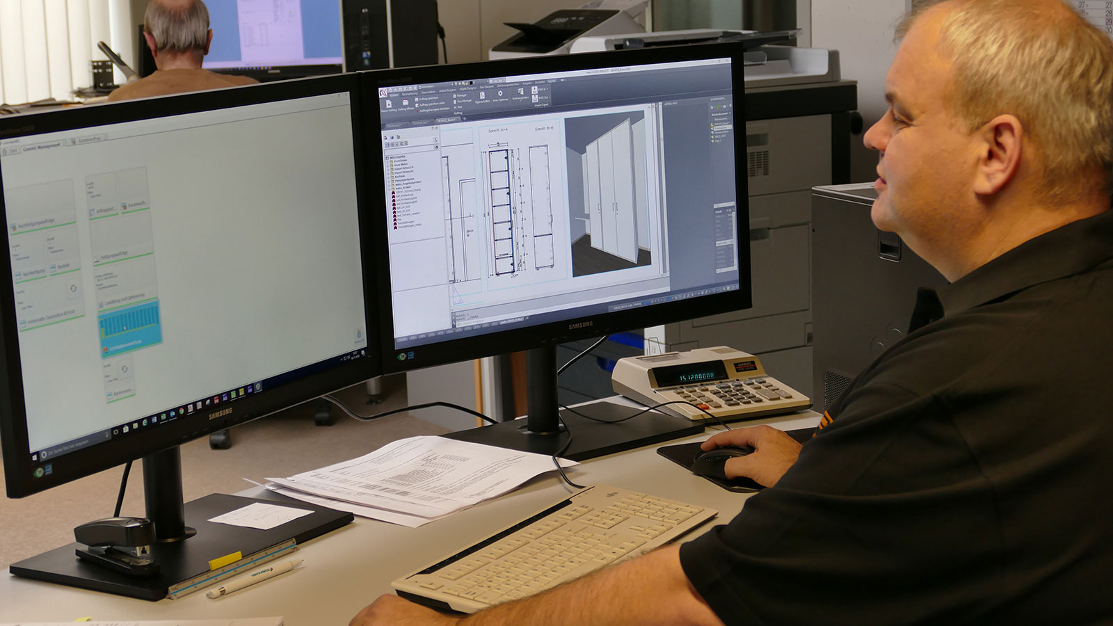Norbert Bosch setzt seit 1985 die Branchensoftware von OS Datensysteme ein. Das CAD-System Imos nutzt er seit 2004, aktuell in der neuen Version Imos iX. Im Bereich der Arbeitsvorbereitung gehen die Aufträge zwei Wege: Standardteile (beispielsweise Schränke mit variablen Abmessungen, Konferenztische in definierten Größen etc.) werden ausschließlich über OSD abgewickelt. Wird es hingegen individuell, ist Konstruktion mit Imos iX angesagt. Ist ein Auftrag fertig geplant, werden die Daten schließlich an ControllerMES übergeben. Bei Bosch kommen aktuell rund 95 % der Daten aus OSD, der Rest aus Imos iX.