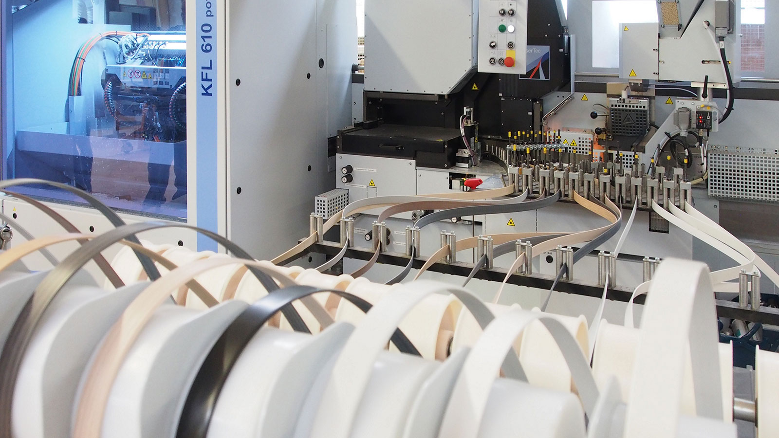 Norbert Bosch ist bekennender HOMAG-Fan. Nahezu alle Maschinen und Anlagen in seiner Fertigung tragen das Logo des Weltmarktführers. So auch die nagelneue Kantenbearbeitungsanlage vom Typ KFL 610 PowerLine. Sie hat sowohl ein Lasertec- als auch ein Schmelzklebeaggregat an Bord und ist konsequent auf Stückzahl 1 getrimmt: In beliebiger Reihenfolge durchlaufen unterschiedlichste Teile die Maschine und werden dabei automatisch mit dem richtigen Kantenmaterial und den individuell erforderlichen Bearbeitungen versehen.