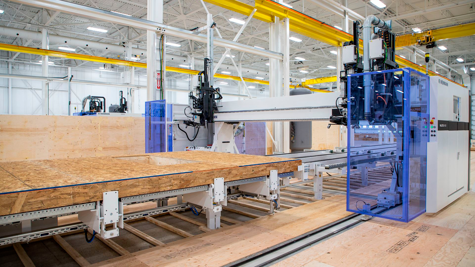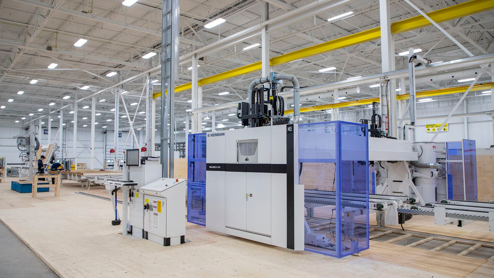 Die WEINMANN Fertigungslinie umfasst Holzbearbeitungsmaschinen, die hauptsächlich für die Erstellung der Riegelwerke und das Bearbeiten der Elemente eingesetzt wird; eine komplette Wandelemente-Fertigungslinie mit Riegelwerkstationen, Montage- und Arbeitstischen, Handlinggeräten und einer Multifunktionsbrücke sowie eine Dach-Decken-Fertigungslinie mit einer automatischen Riegelwerkstation, einem Vakuum-Handlingsystem und einer weiteren Multifunktionsbrücke. „Ausgehend von unserem Standort in Moncton haben wir unseren Markt auf die anderen westkanadischen Provinzen ausgeweitet.“